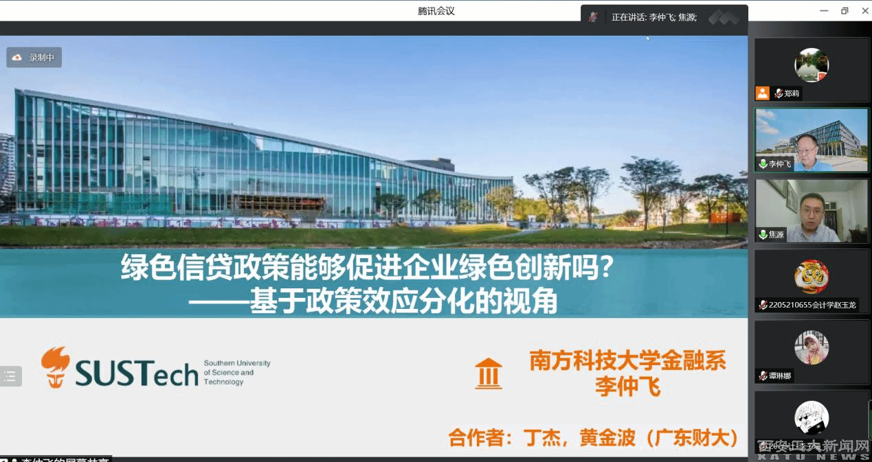李仲飞介绍了在建设“美丽中国”背景下,围绕“2030碳达峰、2060碳中和”的“双碳”目标,基于环境保护与经济发展之间的两难选择,采用DID方法分别检验绿色信贷政策对重污染企业和节能环保企业绿色创新的影响,以期将金融体系中的绿色信贷为引导,促进企业绿色环境创新及企业的转型升级。