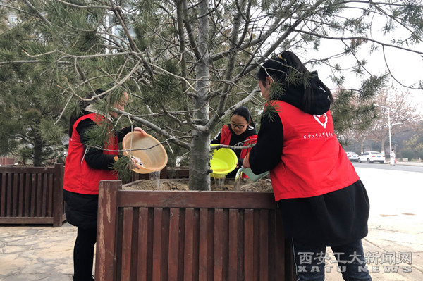 (本网讯)19日,建筑工程学院青年志愿者协会组织20余名志愿者开展了“绿丝带在行动”为校园绿化树浇水护树志愿服务活动,有效保护了校园树木景观,劳动成效和奉献精神受到广大师生的热情点赞。