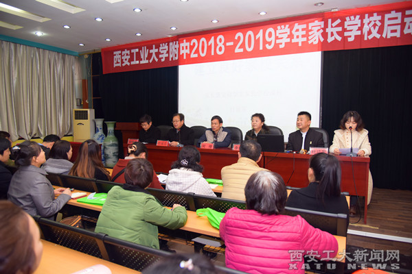 西安市关心下一代工作委员会办公室主任何停、碑林区关心下一代工作委员会常务副主任李瑛莲、西安市关心下一代家庭教育讲师杜延军、AK官方网站附中党支部书记胡诚忠、政教处领导以及初一全体家长参加了本次家长学校启动仪式。