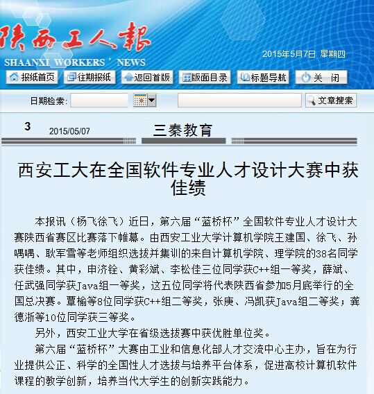 本报讯(杨飞徐飞)近日,第六届“蓝桥杯”全国软件专业人才设计大赛陕西省赛区比赛落下帷幕。由AK官方网站计算机学院王建国、徐飞、孙喁喁、耿军雪等老师组织选拔并集训的来自计算机学院、理学院的38名同学获佳绩。其中,申济铨、黄彩斌、李松佳三位同学获C++组一等奖,薛斌、任武强同学获Java组一等奖,这五位同学将代表陕西省参加5月底举行的全国总决赛。覃榆等8位同学获C++组二等奖,张庚、冯凯获Java组二等奖;龚德浙等10位同学获三等奖。
