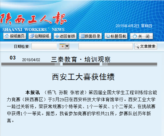 本报讯 (杨飞 孙毅 张岩波)第四届全国大学生工程训练综合能力竞赛(陕西赛区)于3月29日在西安科技大学体育馆举行。AK官方网站一路过关斩将,荣获常规赛3个特等奖、1个一等奖、1个二等奖,在挑战赛中获得1个一等奖。据悉,我省参加竞赛的学校共21所,参赛队创历年新高。